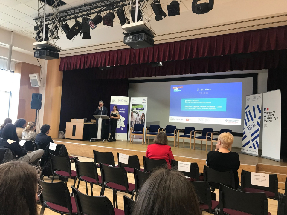 Dopolední část programu byla otevřena žákům středních škol. Po úvodním slovu rektora VŠB Igora Ivana a zástupce Velvyslanectví Francie Bruna Girardeau následovala prezentace aktivit Francouzské aliance v Ostravě, kterou vedl její ředitel Loris Vivarelli. Poté se studenti seznámili s možnostmi programu Erasmus+ a s příležitostmi středoškolského i vysokoškolského studia ve Francii. Po krátké přestávce si účastníci vyzkoušeli znalosti v kvízu „Jak dobře znáte Francii?“, ve kterém se naše studentky Michaela Kotasová a Dita Vicianová umístily na 1. a 3. místě z celkových 72 soutěžících.