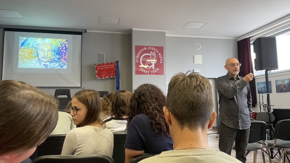 Pro studenty vyššího gymnázia si lektor připravil přednášku na téma Einsteinova teorie relativity a přednášel i o gravitačních vlnách. Profesor Podolský je zajímavě a přehledně seznámil s danou problematikou a díky mnohým obrázkům a grafům mohli jeho výklad pochopit i ti, kteří se o tématu dozvěděli poprvé, nebo ti, kteří se o fyziku příliš nezajímají. Zajímavý výklad a poutavá prezentace studenty zaujaly a určitě je podnítily k bližšímu zájmu o zábavný předmět plný divů – fyziku.