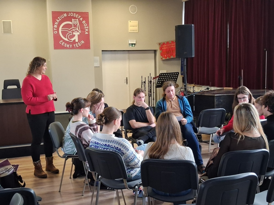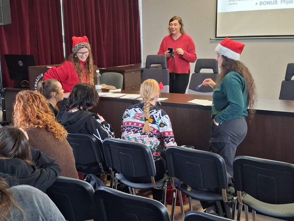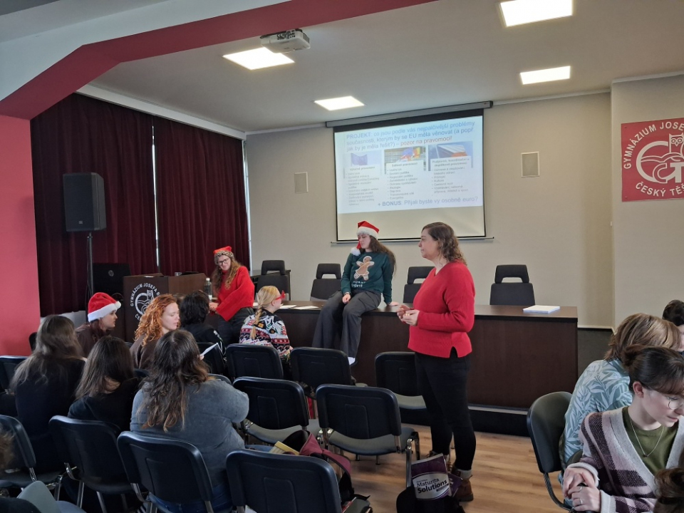 Naše škola měla 18. 12. 2025 možnost přivítat naši absolventku Mgr. Kateřinu Sasovou, jež pracuje pro Evropskou komisi EU. Mgr. Sasová vedla besedu se studenty čtvrtých ročníků o možnostech, které Evropská unie nabízí mladým lidem, a také o orgánech a pravomocích EU.