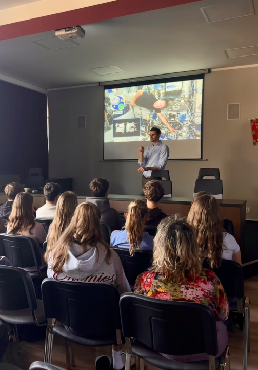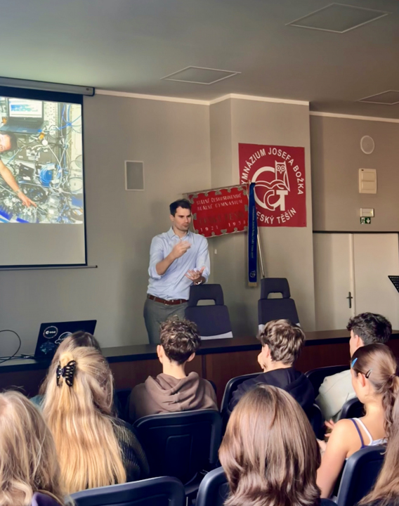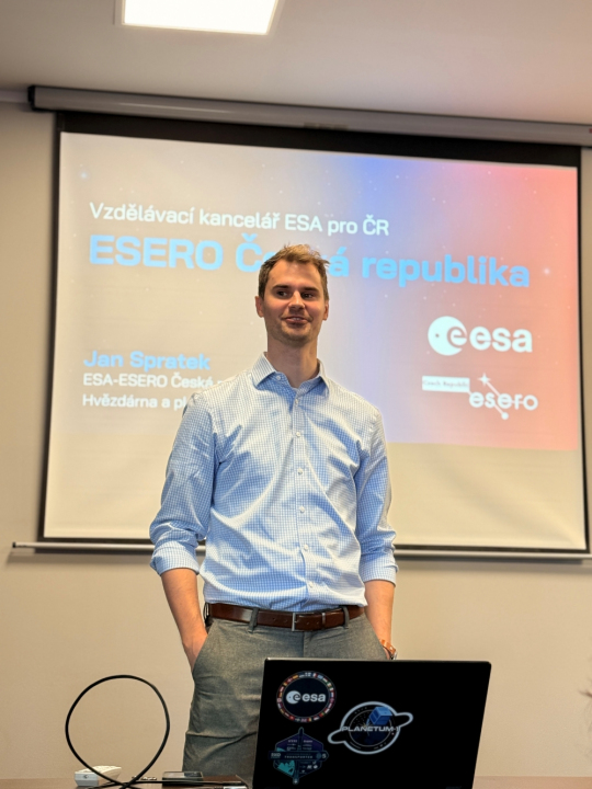 Ve středu 5. 11. 2025 navštívil naši školu odborný pracovník z Hvězdárny a planetária hlavního města Prahy a náš absolvent Jan Spratek. Jan je nositelem ESA Champion Award za prezentaci evropského vesmírného snažení. Je koordinátorem vzdělávací kanceláře Evropské kosmické agentury (ESERO) pro Českou republiku a podílí se na tvorbě vzdělávacích programů v oblasti vesmíru.