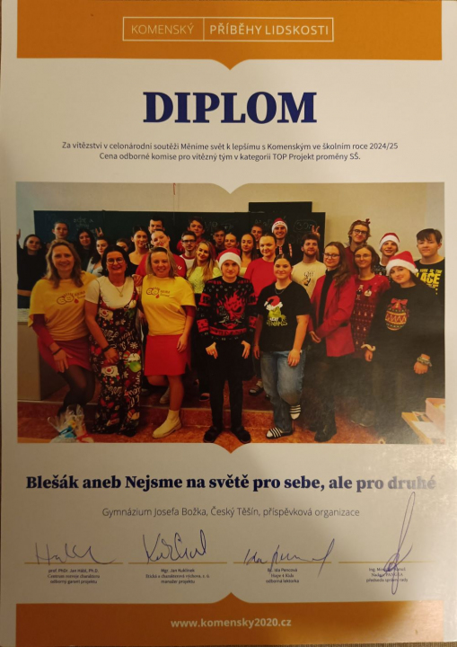 Blešák uspěl v celostátní soutěži „Měníme svět k lepšímu s Komenským“